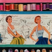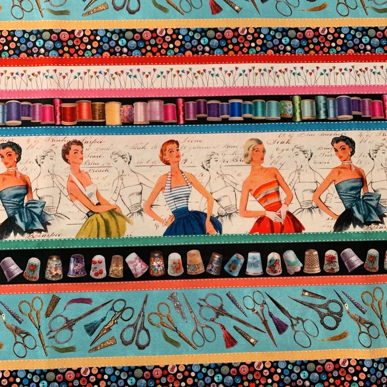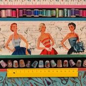 Michael Millerからエイミースチュワートデザインのデジタルプリントです。カラフルな糸やボタン、ヴィンテージのハサミや指ぬき、素敵なドレスを着た美人のお姉さんは、パターンブックのモデルさん。そのままでも、柄ごとにカットして使っても可愛い、欲張り柄です。